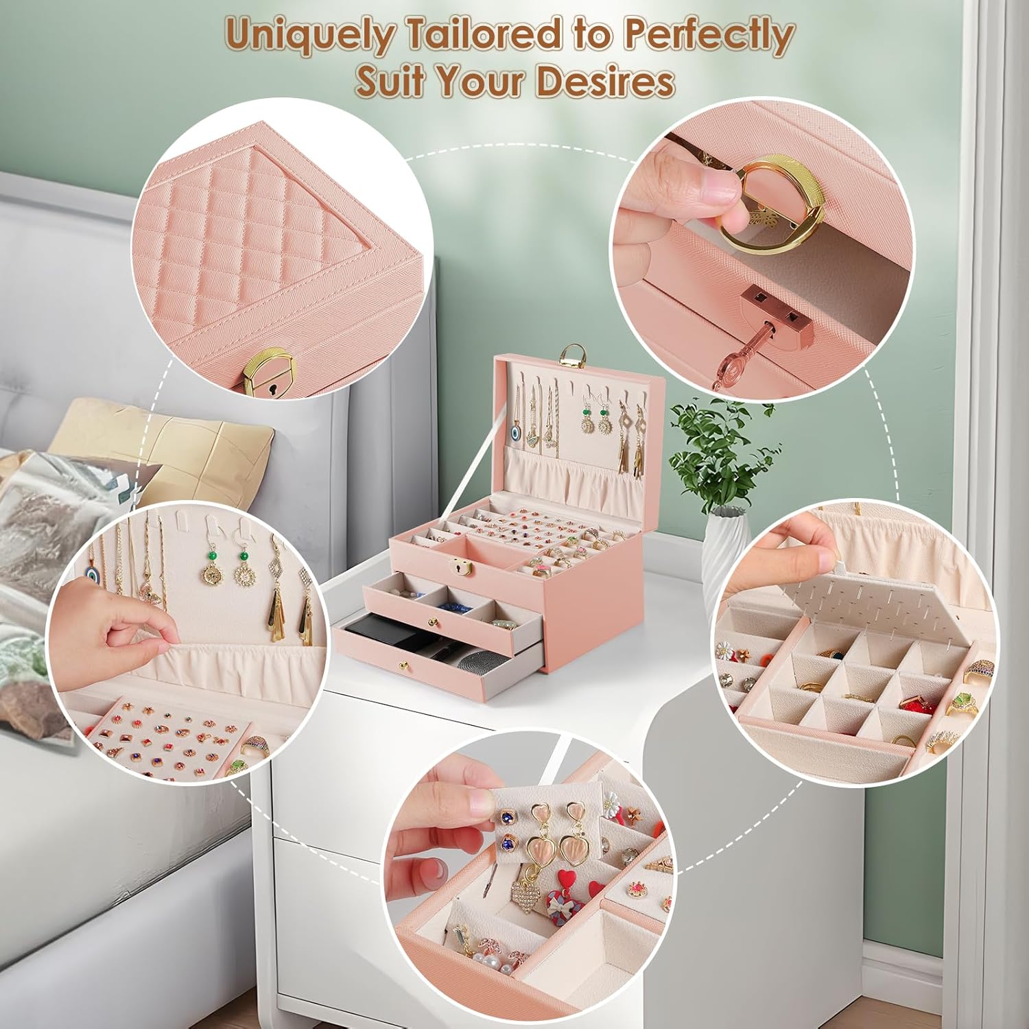 3 Layer Jewelry Box, Jewelry Holder with Lockable Drawer, Large Jewelry Boxes & Organizer with Velvet Earring